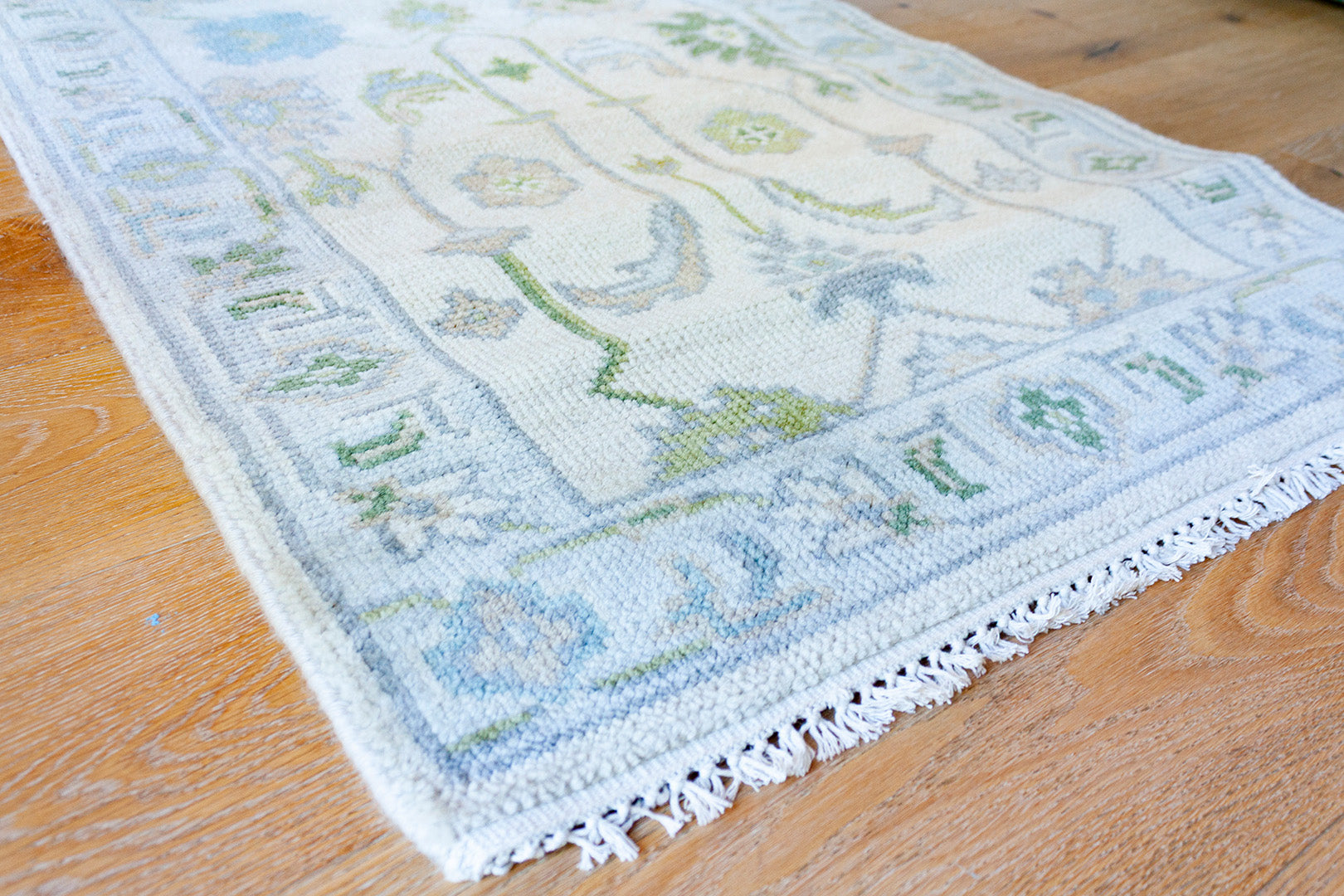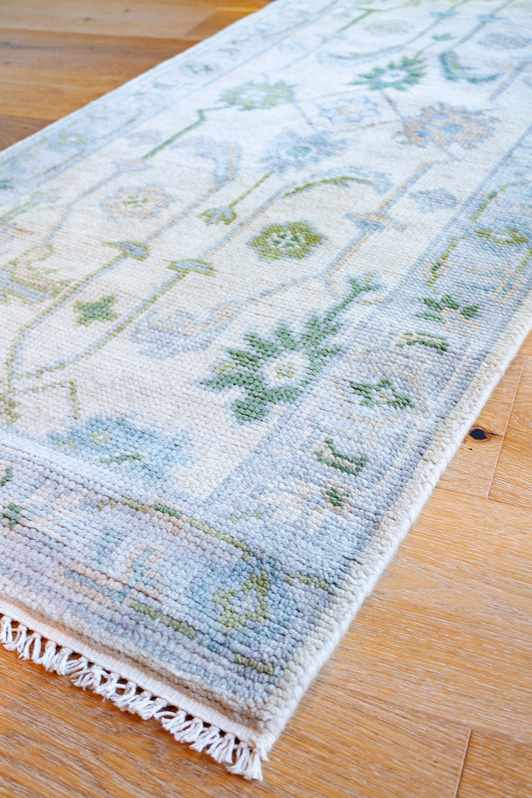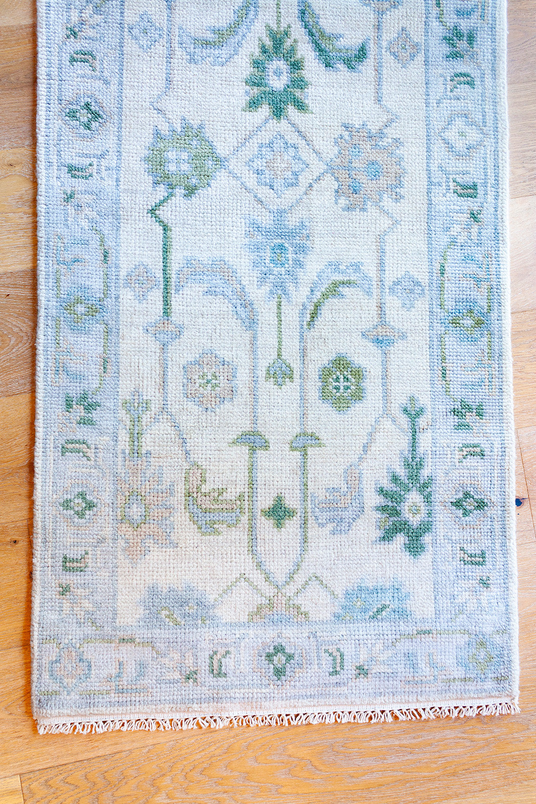 A beautiful handwoven runner featuring a classic Oushak–inspired pattern and blue, white, and green palette.