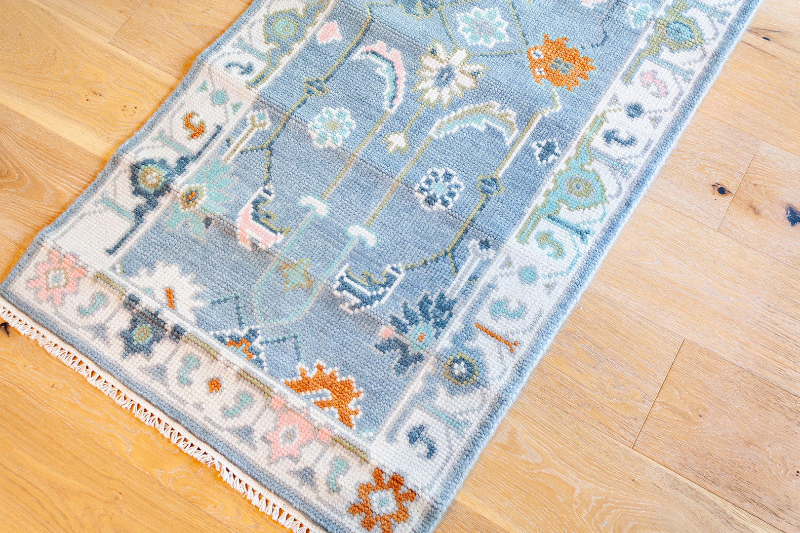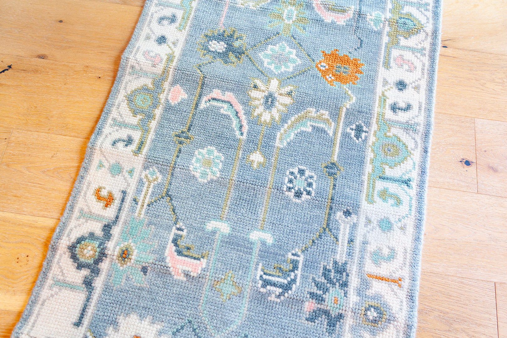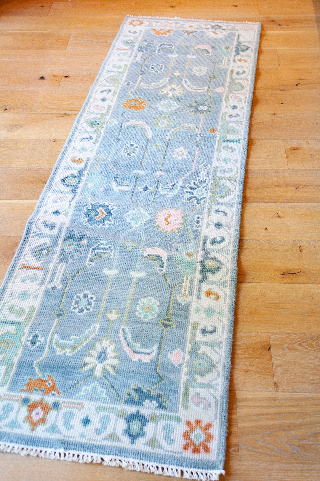 A beautiful handwoven runner featuring a classic Oushak–inspired pattern and multicolor, blue palette.