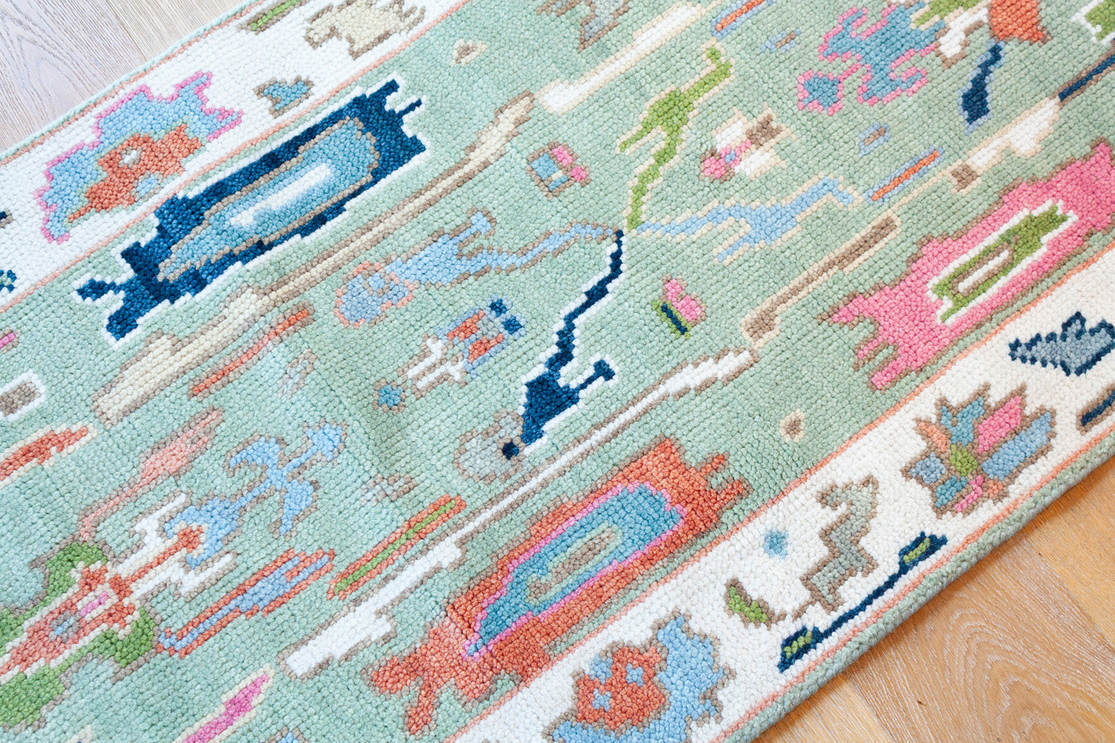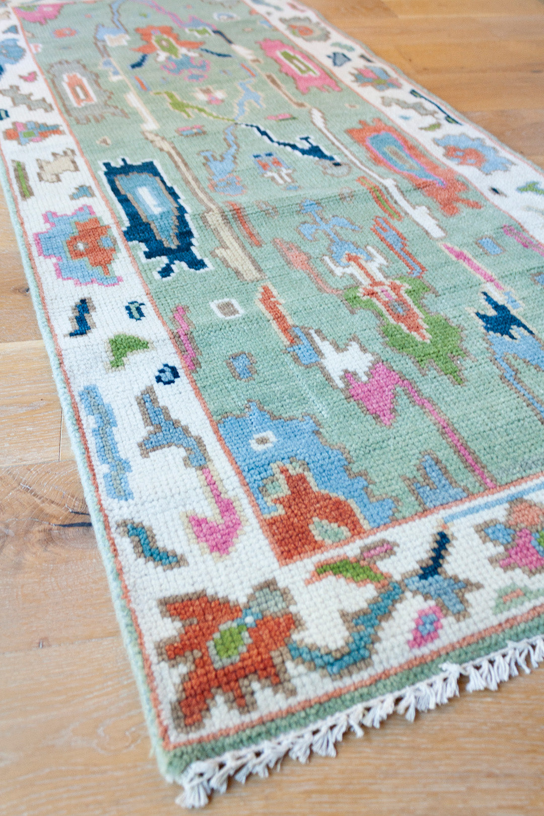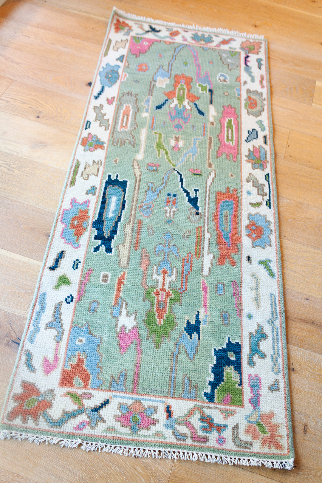 A beautiful handwoven runner featuring a classic Oushak–inspired pattern and multicolor, green palette.