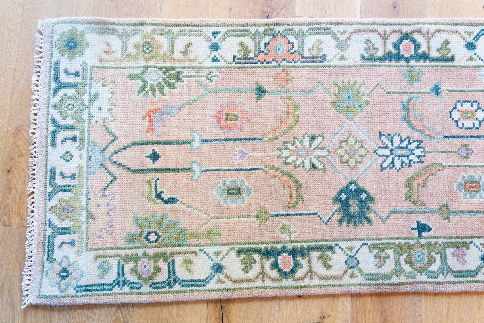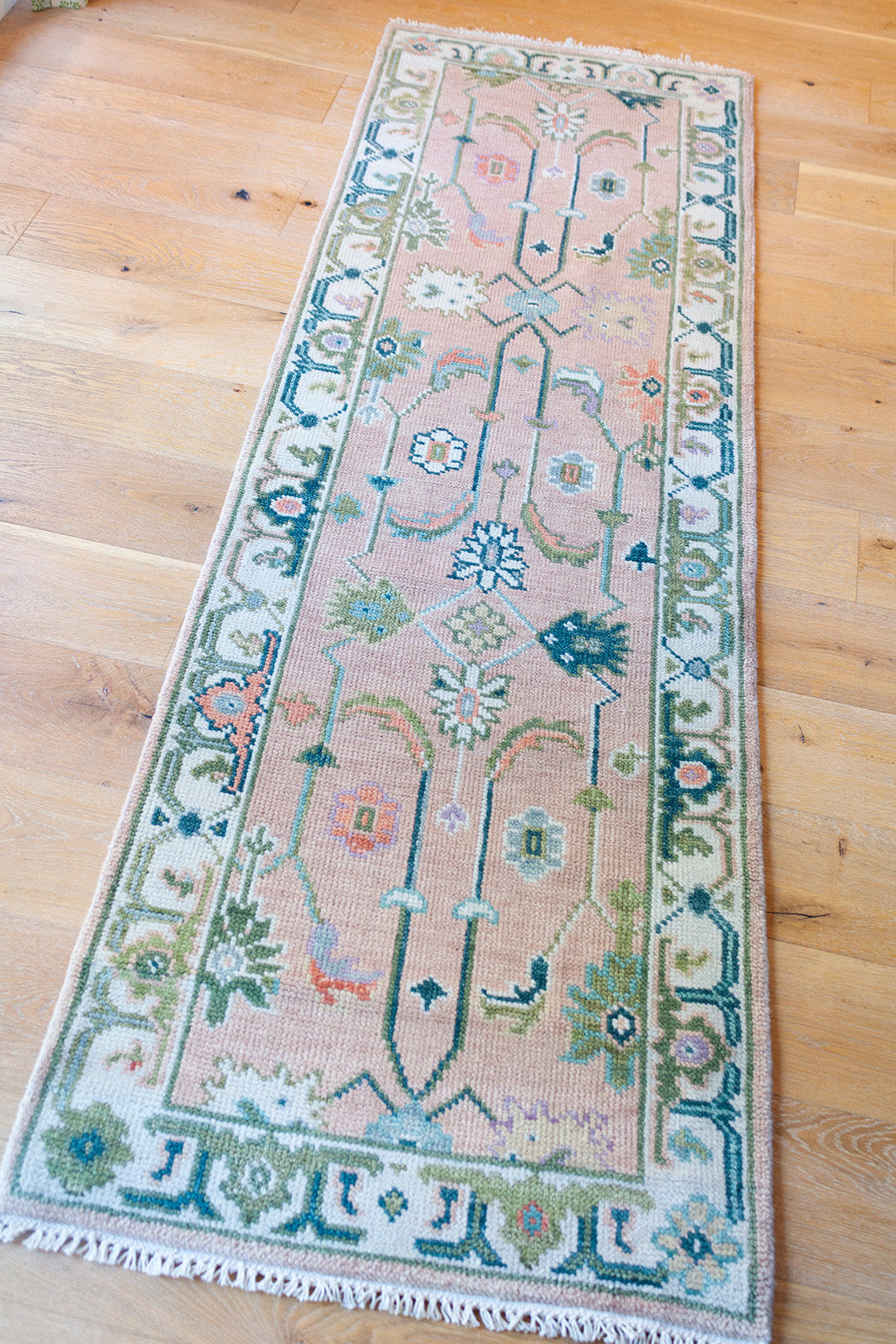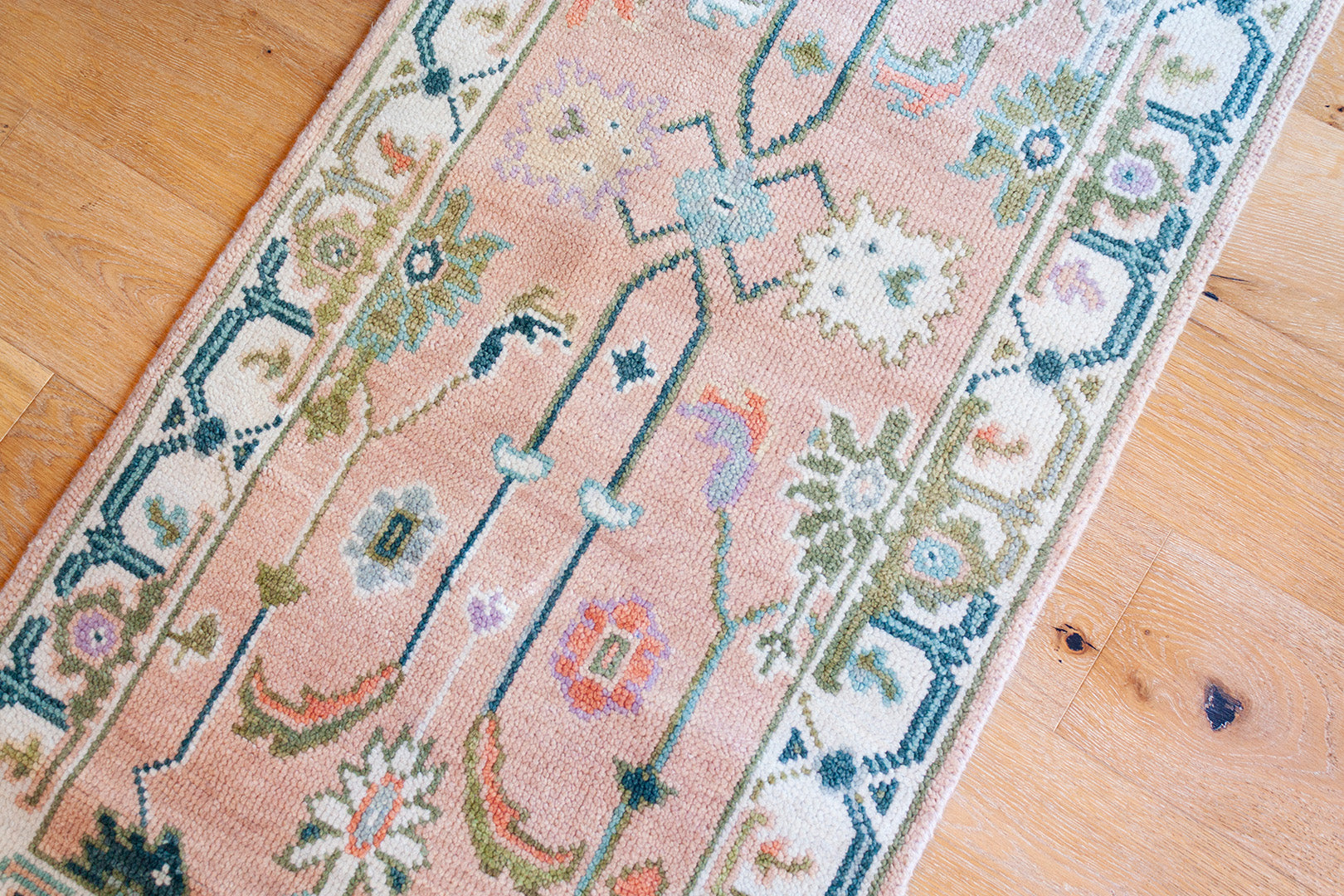A beautiful handwoven runner featuring a classic Oushak–inspired pattern and colorful pink palette.