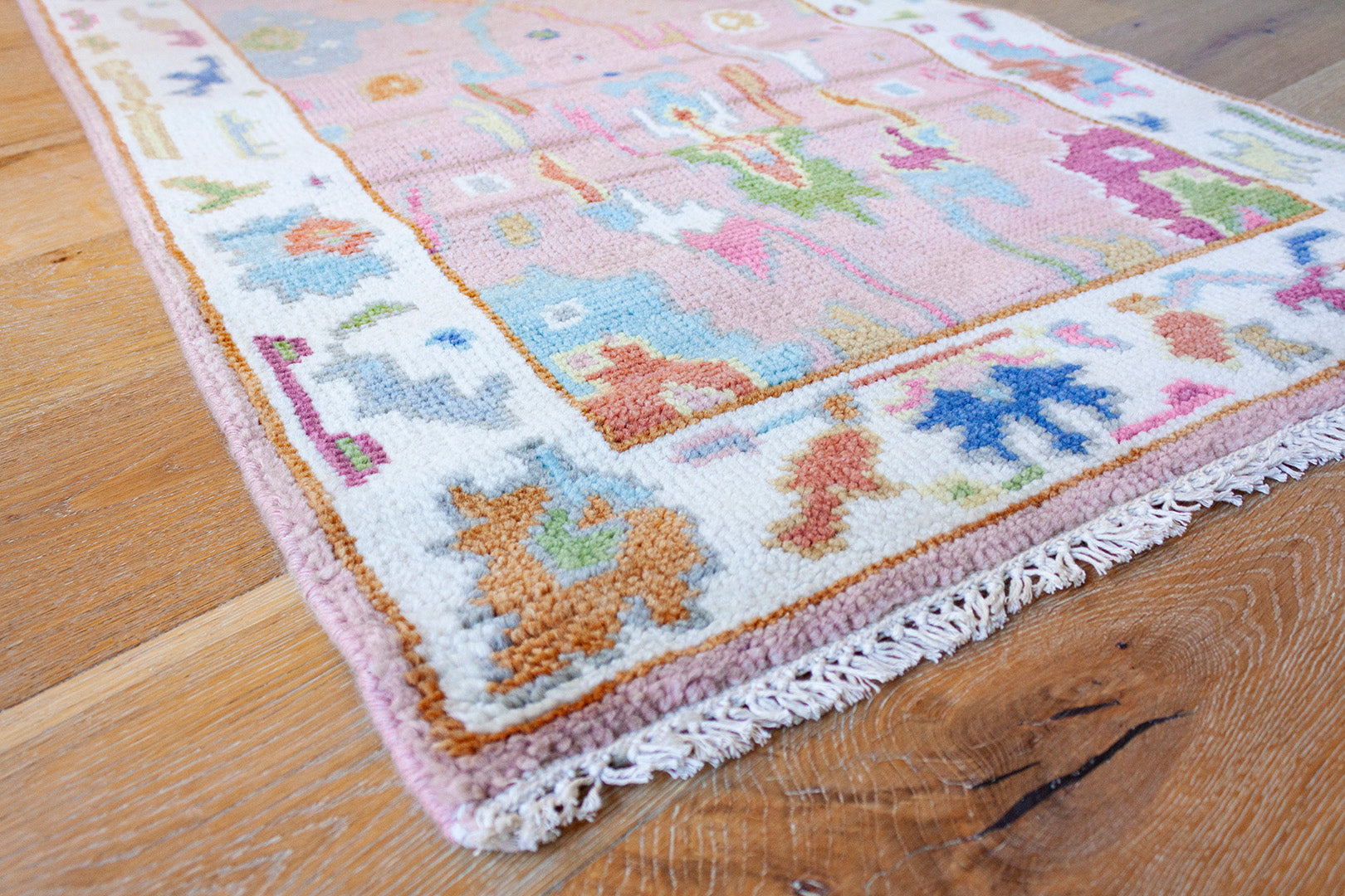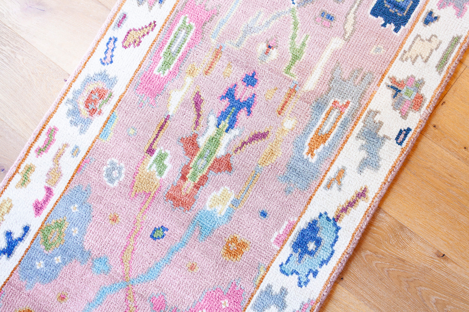 A beautiful handwoven runner featuring a classic Oushak–inspired pattern and colorful pink palette.