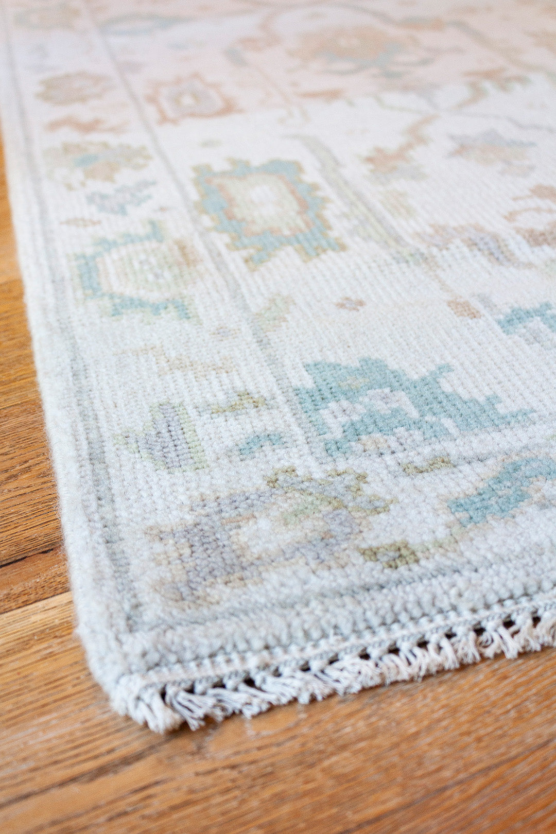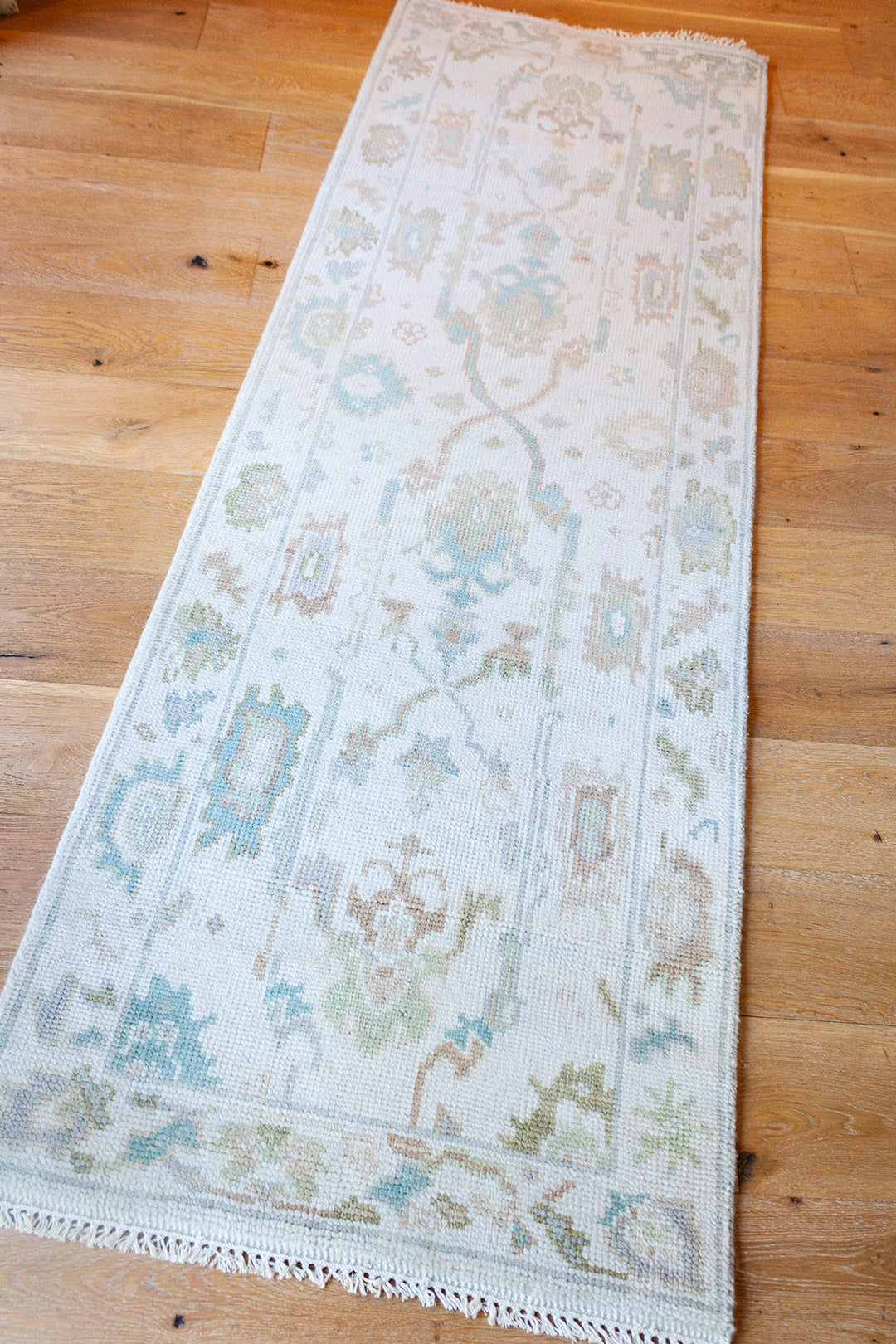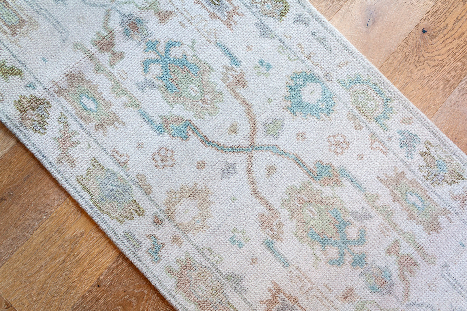 A beautiful handwoven runner featuring a classic Oushak–inspired pattern and white and multicolor palette.